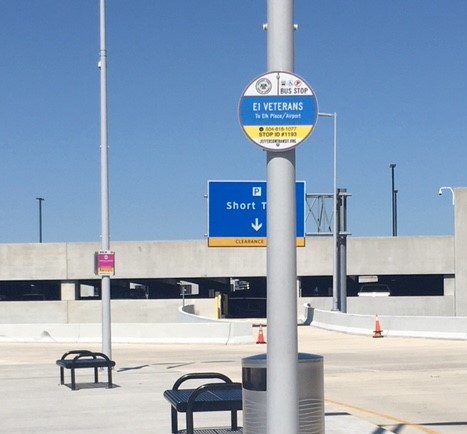 The bus stop at the airport is located on the top level of the departure terminal in the middle walkway of the outside lane, closest to the exit.